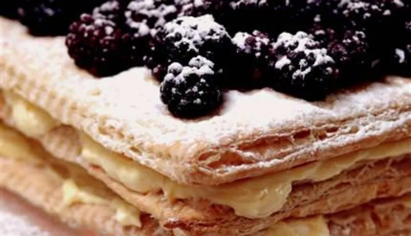 Mutlu sona ulaşmak için önce milföyleri çözdürüp ikiye bölerek 4 eşit dikdörtgen parça oluşturun ve bunları yağlı kâğıdın üzerine yerleştirin. Önceden ısıtılmış 200 derece fırında 15 dakika kadar pişirin. Fırından alıp, üzerine biraz pudraşekeri serperek tekrar fırına verin. 10 dakika daha pişirip çıkartın ve soğumaları için bekletin. Bu arada yumurta sarıları ve şekeri iyice çırparak krema haline getirin. Daha sonra şarabı ilave edip çırpmaya devam edin (bu karışım sıvı olacaktır, merak etmeyin!). Daha sonra "benmari'' usulü pişirmek için, su dolu bir tencerenin üzerine kremanın olduğu kabı koyup, ocağa yerleştirin. Karıştırarak koyulaşana dek ocakta tutun. Kaynamasına ve topaklanmasına izin vermeden ateşten alıp üzerini kapatın (ki kaymak bağlamasın) ve soğumaya bırakın. Bir kapta da krema ile krema sertleştiricisini ya da kremşantiyi çırpıp buzdolabına koyun. Siz yemek sonrası kahvenizi yapana kadar bu malzemeler bekleyebilir. Şaraplı kremanın içine 3 çorba kaşığı kadar diğer kremadan katıp, kaşıkla karıştırın. Merengi (beze) ufalayarak kremaya ilave edin (ya da kuru yemişleri). Soğumuş milföy katları arasına bu krema karışımından bolca sürün (taşabilir). En üste ise, çözdürdüğünüz meyveleri (ya da bulabildiyseniz taze) dizip, pudra şekeri serperek süsleyin. İşte MUTLU SON!