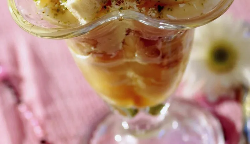 Muzu küp şeklinde doğrayın. Rendelenmiş elma ve limon suyunu karıştırın. Ayrı bir kasede krema ve balı karıştırın. Kuplara sırasıyla bir sıra muz, bir sıra elma ve bir sıra kremalı bal olacak şekilde koyun. Tekrar aynı işlemi uygulayın. En üste muz parçalarından yerleştirip üzerlerine bal gezdirin, Hindistan cevizi ve antep fıstığı serpin. Buzdolabında en az 1 saat bekletin ve soğuk olarak servis yapın.