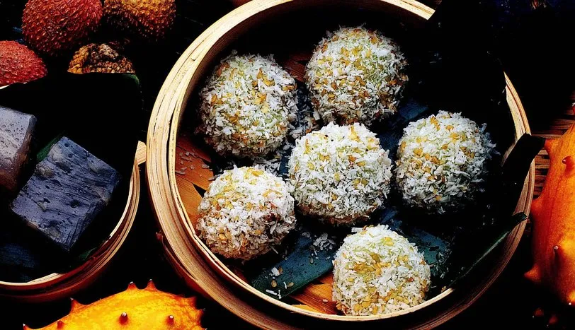 Pirinç unu, nişasta, tuz ve pandan suyunu karıştırın. Daha sonra gıda boyası, şeker ve susamı ilave edin. Özleşene dek yoğurun. Elinizde yuvarladıktan sonra rendelenmiş hindistancevizine bulayın.AŞÇININ NOTUPandan veya pandanus, Malaya kökenli, kama yapraklı bir bitkidir. Singapur mutfağında pilavlardan tatlılara kadar pek çok yerde kullanılır.