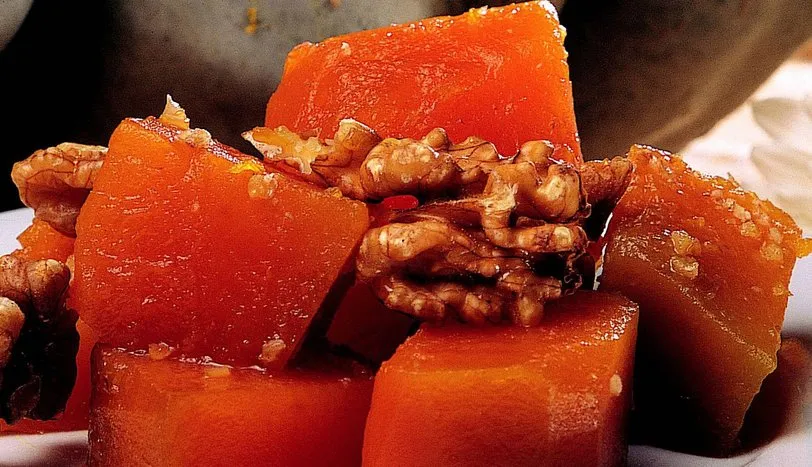 Kabaklar iyice yumuşayınca kalan 2 çay kaşığı damla sakızını eşit şekilde kabakların her yerine serpin. 2-3 dakika daha pişirip ocağın altını kapatın. Soğuduğunda dövülmüş cevizle servis yapın.