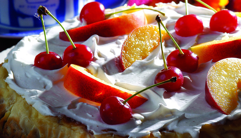 Kepekli bisküviyi elinizle ufalayın. Tereyağını eritip ufalanmış bisküvi ve 1 su bardağı dövülmüş bademi karıştırın. Orta büyüklükteki kelepçeli kek kalıbının dibine bisküvili karışımı bastırarak yayın. Buzdolabında yarım saat bekletin. Başka bir kapta yarım su bardağı toz şekerle yumurta sarılarını çırpın. Labne peyniri ve kremayı ekleyerek çırpmaya devam edin. Bir kabın içinde yumurta aklarını mikserle en yüksek devirde çırparak köpük haline getirin ve diğer karışıma ekleyip karıştırın. Şeftalilerin kabuklarını soyup kuşbaşı şeklinde doğrayın ve hamura ilave edin. Kalıptaki bisküvinin üzerine bu karışımı boşaltın. Önceden ısıtılmış 175 derece fırında hafif pembeleşene kadar pişirin. Fırından çıkardığınız kalıbı biraz oynatarak soğumaya bırakın. Kremayı pudra şekeri ile çırpın. Servis tabağına aldığınız kekin üzerine sürün. Şeftali ile süsleyerek servis yapın.AŞÇININ NOTUKekin üzerini değişik meyvelerle de süsleyebilirsiniz.