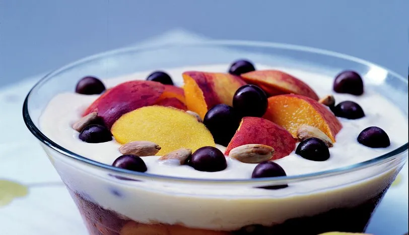 Şeftali jölesini 2 su bardağı kaynamış suyla karıştırarak eritin. 2 su bardağı soğuk su ekleyip karıştırın. Şeftalilerin 3 tanesini dilimleyin. Büyük cam bir kaseye şeftalileri, üzüm, kiraz ve bademlerin yarısını yerleştirin. Jöleyi döküp 4-5 saat buzdolabında dondurun. Diğer taraftan süt, krema, vanilya çubuğu ve toz şekeri bir tencereye alın. Çırpılmış yumurtaları da tencereye katın. Devamlı karıştırarak yavaş yavaş unu ekleyin. Koyulaşmaya başladığında vanilya çubuğunu çıkartın. İyice koyulaşınca ocaktan alıp, 4-5 dakika karıştırarak soğutun. Jölenin üzerine dökün. Kalan şeftali, üzüm, kiraz ve bademle süsleyip, servis yapın.