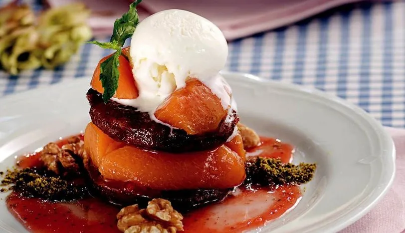 Öncelikle şerbeti hazırlayın. Bunun için toz şeker ve suyu bir tencereye alıp ocağa oturtun. Kaynamaya başladıktan 5 dakika sonra liman suyunu katın. Bir-iki taşım daha kaynatıp ocaktan alın ve soğumaya bırakın. Şeftalileri ikiye bölüp çekirdeklerini çıkarın. Daha sonra dilimleyin. Çekirdek yatakları yukarı bakacak şekilde bir fırın kabına yerleştirin. Üzerlerine toz şeker serpin. Karanfil ve tarçını koyup, kabın üzerini alüminyum folyo ile kapatın. Önceden ısıtılmış 200 derece fırına verin. Şeftalilerin suyu çıkmaya başlayınca, folyoyu çıkarın. 5 dakika daha pişirip ocaktan alın ve soğumaya bırakın. Hamuru için yumurta, yoğurt ve 1 çay bardağı zeytinyağını birlikte çırpın. Unu düz bir zemine eleyin. Ortasını havuz şeklinde açıp, yumurtalı karışımı dökün ve yoğurun. Cevizi katıp yeniden yoğurun. Kulak memesi kıvamında bir hamur elde edince, üzerine nemli bir bez örtüp 30 dakika dinlendirin. Hamuru 3 mm kalınlığında açın. Su bardağı ağzıyla yuvarlaklar kesin. Daha sonra sıvı yağda önlü arkalı kızartın. Sıcakken soğuk şerbete atın. Hamurlar şerbeti çekince çıkarın. 1 adet şerbetli hamuru servis tabağına koyun. Üzerine 2-3 dilim şeftali yerleştirin. Yeniden bir parça hamur koyup, şeftali yerleştirin. Kalan hamur ve şeftalileri de aynı şekilde hazırlayın. Üzerlerine birer top dondurma koyup, nane yaprağı ile süsledikten sonra servis yapın.