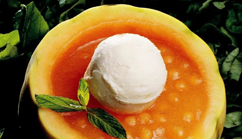 Kavunların üst kısmını kesin. Bir kaşık yardımı ile çekirdeklerini temizleyin. Dondurma kaşığı ile içlerindenbirkaç top çıkarın. Daha sonra içlerindeki etli kısmı alıp blenderden geçirin. Arzu ederseniz, birkaç dal ince kıyılmış nane ekleyin. Bu karışımı, önceden içini oyduğunuz kavunlara doldurun. Üzerlerine birer top dondurma ekleyin. Nane yaprakları ile süsleyerek servis yapın.