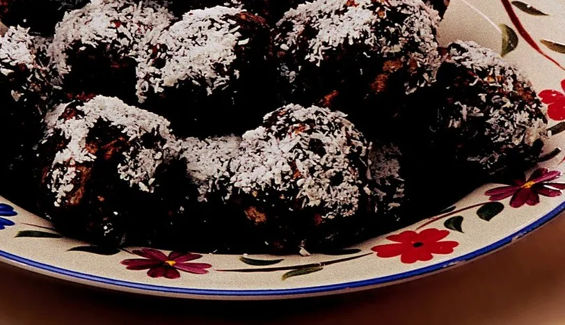 Süt, meyve şekerlemesi, damla çikolata ve ceviz içini derin bir kaba alın. Kakaoyu ekleyip, kaşıkla iyice karıştırın. Bisküvileri elinizle minik parçalar halinde kırarak bu karışıma ilave edin. Önce parmak uçlarıyla karıştırmaya başlayıp, sonra malzemeyi iyice yoğurun. Ceviz büyüklüğünde parçalar koparıp yuvarlayın. Buzdolabında 1 saat kadar beklettikten sonra hindistan cevizine bulayıp servis yapın.