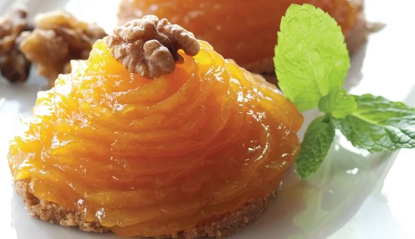 Bal kabağını küçük parçalar halinde dilimleyip, bir tencereye alın. Üzerine toz şeker ve tarçın ekleyin. Tencerenin kapağını kapatıp, kısık ateşte kabak yumuşayana dek pişirin. İçinden tarçını alın. Kabak soğuduktan sonra blenderden geçirip, sıkma torbasına alın. Bisküvi ve tereyağını birlikte blenderdengeçirin. Yağlı kağıt serilmiş bir fırın tepsisine, dört adet küçük çember kalıp koyun. İçlerine elinizle bastırarak tereyağlı bisküvi yerleştirin. Önceden ısıtılmış 170 derece fırında 3 dakika pişirin ve soğumayabırakın. Soğuduktan sonra çemberleri alın. Bisküvi tabanlarını bir spatula ile servis tabaklarına aktarın. Üzerine bal kabağı püresi sıkın. Tahin gezdirin. Yarım ceviz koyup, nane yaprakları ile süsleyerek servis yapın.