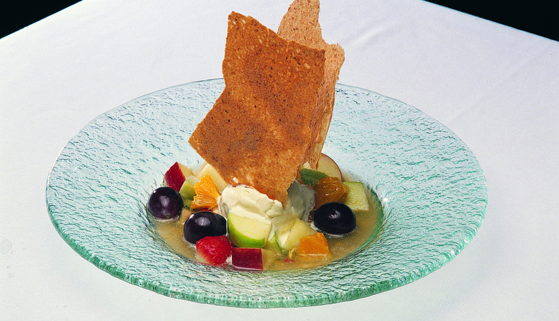 Taze meyve salatası, meyve şurubu ve dondurma ile