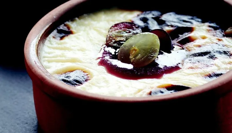 Süt, toz şeker, üzüm suyu, pirinç, mısır nişastası ve yumurta sarısını karıştırarak pişirin. Üzüm ekleyip karıştırın. Karışımı toprak kaplara pay edin.Fırının üst kısmını açıp, tatlının üzeri hafif yanana dek pişirin. Üzüm jölesi ve dilimlenmiş üzümle servis yapın.
