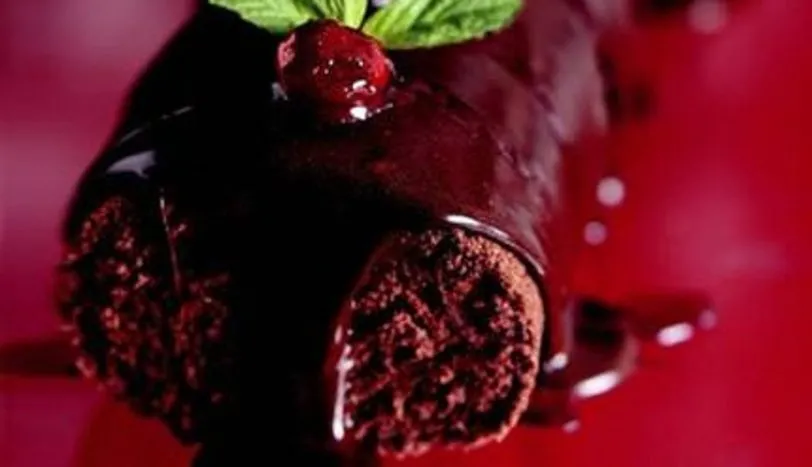Öncelikle krema için çikolatayı benmari usulü eritin ve ocaktan alın. Vişne reçeli suyunu ilave edip karıştırın. Kremayı ekleyin ve tekrar karıştırıp, ılınması için bir kenara alın. Kek için derin bir kapta yumurta sarıları ile toz şekeri iyice çırpın. Elenmiş un ve kakaoyu ilave edip, karıştırın. Ayrı bir kapta yumurta akları ile tuzu köpük haline gelene kadar çırpın. Köpüğünü gidermeden kakaolu karışımın içine katın ve yağlı kağıt serilmiş fırın tepsisine yayın. 175 derece fırında 10-15 dakika pişirin. Kremadan 1 çay bardağı ayırıp, kalanını sıcakken kekin üzerine sürün. Temiz bir havlunun üzerine koyup rulo yapın. Üzerine ayırdığınız 1 çay bardağı kremalı karışımı gezdirin. Vişne taneleri ve nane yaprağı ile süsleyerek servis yapın.