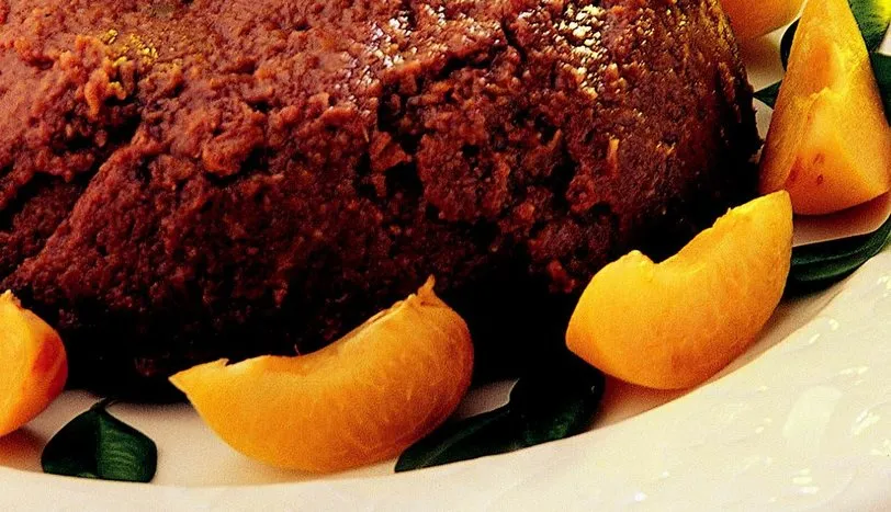 Kayısıların çekirdeklerini çıkarın ve zar şeklinde bir tencereye doğrayın. Üzerine toz şekerin yarısını ve margarini ilave edip karıştırarak püre haline gelene dek pişirin. Ayrı bir kaseye acı badem kurabiyesi ve bisküviyi iyice ufalayın. Kakao, tarçın, sıcak suda bekletilip yumuşatılmış kuru üzüm, ayrı ayrı çırpılmış yumurta sarısı ve aklarını, artan toz şeker ve suyu ekleyin. Tüm malzemeyi karıştırın. En son kremayı ekledikten sonra bir daha karıştırın ve bu karışımı kayısı püresinin içine ilave edin. Karışımı çukur bir cam kabın içine boşaltın ve üzerini düzeltin. Önceden ısıtılmış 160 derece fırında 10-15 dakika pişirin. Piştikten sonra buzdolabında soğutun ve servis tabağına ters çevirip çıkarın. Şeftali dilimleriyle süsleyip servis yapın.