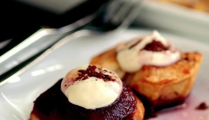 Elmaların kabuklarını soyup ikiye kesin ve fırına uygun bir kaba dizin. Ortalarındaki çekirdekli kısmı temizleyin ve içlerini hafifçe oyun. Toz şeker ve tereyağını kaşık yardımı ile iyice ezin ve elmaların içlerine eşit miktarda koyun. Fırını 200 dereceye ısıtın. Elmaları dizdiğiniz fırın kabının dibine kırmızı şarabı dökün ve 25 dakika fırında pişirin. Yoğurdun içine esmer şekeri ve vanilyayı ekleyerek iyice karıştırın. Fırından aldığınız elmaları servis tabağına koyun ve üzerilerine hazırladığınız yoğurt sosunu dökün. Fırın kabında kalan şaraptan bir miktar alarak yoğurt sosunun üzerine ekleyin. Fındık ile süsleyerek servis yapın.
