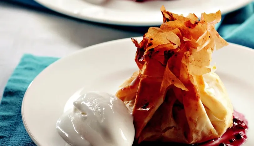 Baklava yufkalarını 6' şarlı iki gruba ayırın ve aralarına eritilmiş tereyağı sürerek, üst üste koyun. Daha sonra yufkaları 4 eşit parçaya kesin. Diğer yufkaları da aynı şekilde hazırlayın. 2 Elmaların kabuklarını soyun ve küp şeklinde doğrayın. Bir tencereye alıp toz şekerle birlikte yumuşayana kadar pişirin. Tarçın ve ceviz ekleyip, karıştırdıktan sonra soğumaya bırakın. Yufkanın üzerine elmalı iç harçtan 1 çorba kaşığı koyup, büzerek bohça şekli verin. Diğer yufkaları da aynı şekilde hazırlayın ve fırın tepsisine yerleştirin. Önceden ısıtılmış 180 derece fırında üzeri kızarana kadar pişirin. Ilındıktan sonra servis tabağına alın. Sos için böğürtlen, frambuaz, su ve toz şekeri bir tencereye koyun. Mısır nişastasını az suda açın ve meyvelere ekleyip, karıştırdıktan sonra pişirin. Tatlıyı meyve sosu ve 1 top dondurma ile birlikte servis yapın.