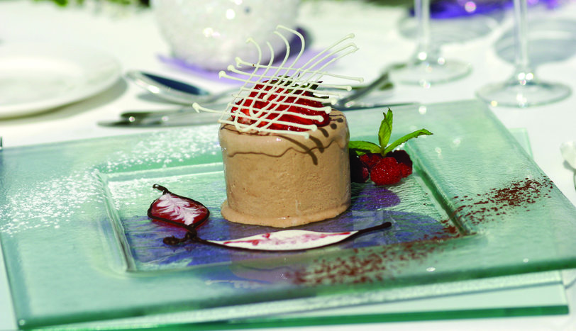 Şekerle yumurta sarıları mikserle çırpın. Kremayı da mikserle köpürtün. Jelatin yapraklarını buzlu suda eritin. Çikolatayı benmari usulü eritin. Yumurta aklarını çırparak köpürtün. En son bu karışıma ekleyin. 5 adet küçük kalıba bu malzemeyi doldurun. Derin dondurucuda 4 saat bekletin. Sonra tatlıları servis tabağına ters çevirin. Üzerine, erittiğiniz beyaz çikolatayı gezdirin. Sos malzemesini kaynatıp, mikserle çırpın. Tatlılarla birlikte servis yapın.AŞÇININ NOTUBenmari usulü eritmek: Kaynayan su dolu bir tencerenin içine konulan küçük bir kaba çikolata yerleştirilir ve bu şekilde eritilir.