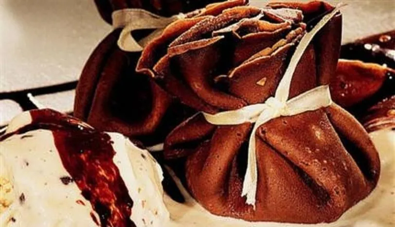 Bir kapta yumurta, süt, un ve kakaoyu çırpın. 10 dakika dinlendirdikten sonra, karışımdan 4 adet krep çıkacak şekilde, yağsız yapışmaz yüzeyli tavaya dökün. Tavayı sağa sola sallayıp yuvarlak oluşturun ve krep tavadan ayrılır hale geldiğinde diğer yüzünü çevirin. 1-2 dakika daha pişirin. Krepleri tek tek pişirdikten sonra, yağlı kağıda aktarıp bir süre bekletin. Dondurmayı kreplerin içine pay edin. Bohça şeklinde maydanoz sapı ile bağlayın veya rulo şeklinde sarıp dilimleyin, Çikolatalı sos ve krema ile servis yapın.