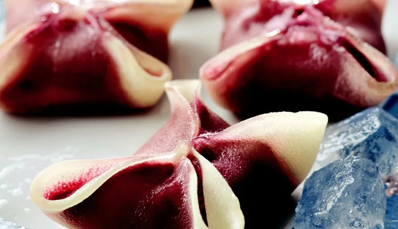 Bir adet lokumun altına ve üzerine pudra şekeri serpip merdane yardımıyla incecik açın. Kare şeklindeki lokumun ortasına 1 top vişneli dondurma yerleştirip 4 ucundan mantı şeklinde tutturun. Kalan lokumlara da aynı işlemi uygulayın. Soğuk olarak servis yapın.
