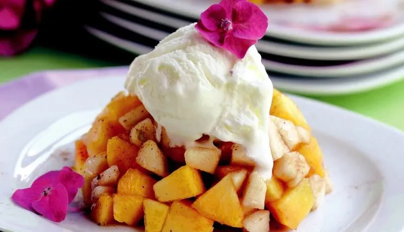 Şeftalileri soyun ve küp şeklinde doğrayın. Armutların da kabuklarını soyun ve daha küçük küpler halinde doğrayın. Doğranmış şeftali ve armudu tarçın ile karıştırın. Pasta tabaklarına pay edin. Üzerlerine birer top dondurma yerleştirin ve servis yapın.