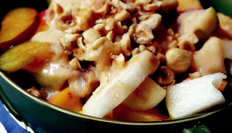 Armutların kabuklarını temizleyip, doğrayın. Mürdüm eriklerini iyice yıkadıktan sonra çekirdeklerini çıkartın ve doğrayın. Şeftali ve muzu robottan geçirin. Daha sonra doğradığınız meyvelerin üzerine gezdirin. Limon suyu ile yoğurdu birlikte çırpın. Bu sosu da meyvelerin üzerine dökün. Son olarak iri dövülmüş fındığı serperek servis yapın.