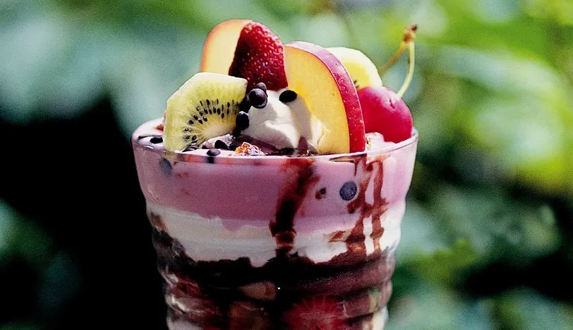 Çırpılmış kremanın yarısını ayırın. Diğer yarısına frambuaz marmeladını karıştırın. Bardağa eritilmiş çikolatayı koyun. Üzerine sade kremayı aktarın. Meyveleri ve fıstığı serpiştirin. Dondurmayı koyun. En son frambuazlı kremayı koyun. Meyvelerle süsleyin.