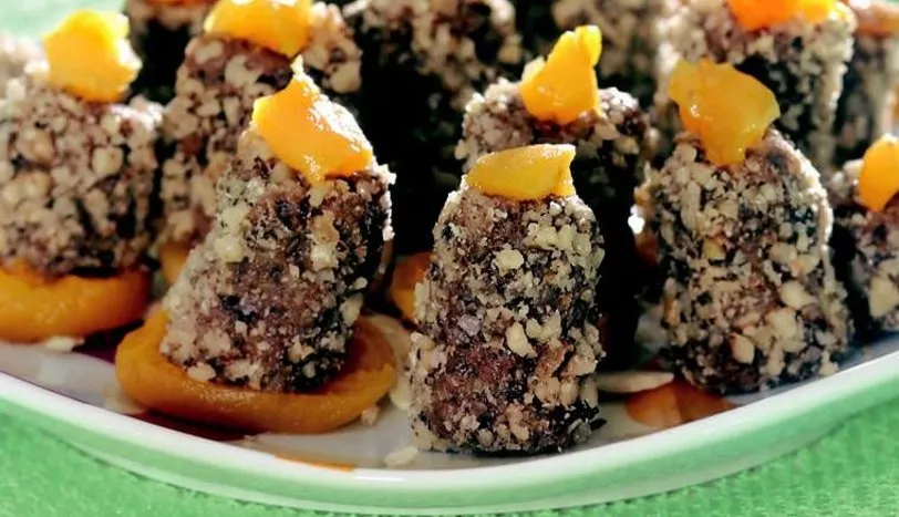 Kayısıları akşamdan suda bekletin. Cevizin içinden 3 çorba kaşığını kenara ayırın. Kayısıların 10 adeti ve diğer malzemeleri robota koyup birlikte çekin. Hazırladığınız karışımdan sıkma pompası ya da elinizle minik şekerlemeler yapın. Şekerlemeleri cevize bulayıp dolapta 1 saat bekletin. Kalan kayısıları ikiye bölüp servis tabağına döşedikten sonra şekerlemeleri üzerine yerleştirip servis yapın.