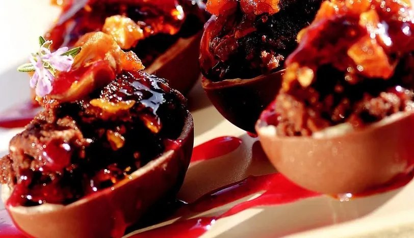 Önce kestaneli krokanı hazırlayın. Bunun için, toz şeker ve suyu bir tavaya alın. Orta ateşte köpürene ve rengi koyulaşana kadar pişirin. Haşlanmış kestaneleri dörde bölün. Daha sonra yağlı kağıt üzerine yerleştirin. Ocaktan aldığınız sıcak karameli üzerine dökün. Yağılı kağıdı sağa sola sallayarak kestaneleri karamele bulaştırın. Soğumaya bırakın. Diğer taraftan yumurta çikolataları ikiye bölüp servis tabağına yerleştirin. İç harcı için de kestaneleri bir kaba alın ve üzerine bitter çikolatayı rendeleyin. Pudra şekeri, tereyağı ve ceviz ekleyip karıştırın. Harcı yumurta çikolatalara paylaştırın. Soğuyan kestaneli karameli küçük parçalar halinde kırın. Daha sonra çikolata çanaklarının üzerine yerleştirin. Çilek sos gezdirerek servis yapın.AŞÇININ NOTUKaramel hazırladığınızda, tavadan alırken çok sıcak olacağından, elinizin yanmamasına dikkat edin!