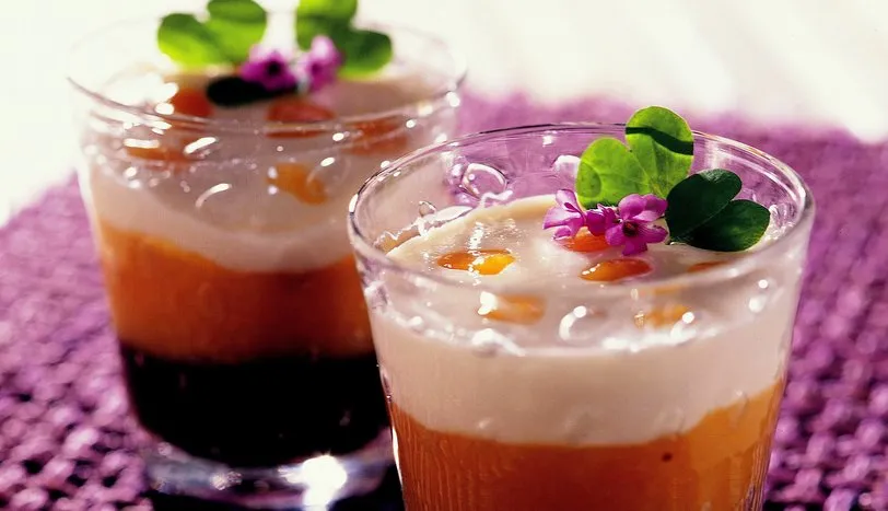 Kayısıları ayıklayıp, yıkadıktan sonra, 5 çorba kaşığı toz şeker ve yarım su bardağı su ile ocağa koyup, pişirin. Piştikten sonra, robottan geçirerek, püre yapın. Biraz soğumasını bekleyin. Üzerine reçel yap döküp, tekrar ocağa koyun. Karıştırarak 5-10 dakika daha pişirin. Göz göz olmaya başlayınca, ocağın altını kapatın. Arzuya göre likörü döküp, soğutun. Diğer tarafta bir buçuk su bardağı sütü, kalan 5 çorba kaşığı toz şekerle ocağa koyun. Nişasta ve unu kalan yarım bardak sütün içinde ezin. Kaynamaya başlayan ocaktaki süte katın.Kaşıkla sürekli karıştırarak, krema kıvamına gelene dek pişirin. Malzemeyi ocaktan indirip ikiye bölün. Yarısına kakao ekleyin ve bardakların dibine pay edin. Hafif kabuk tutması için 2-3 dakika bekledikten sonra püre haline getirdiğiniz kayısıyı ekleyin (Bu arada beyaz muhallebiyi sürekli karıştırın ki sertleşmesin). Kayısının üzerine kalan muhallebiyi koyun. Buzdolabında soğutup, nane yapraklarıyla birlikteservis yapın.AŞÇININ NOTU“Reçel yap”, pratik reçel yapma malzemesidir. Yerine toz jöle de kullanabilirsiniz.