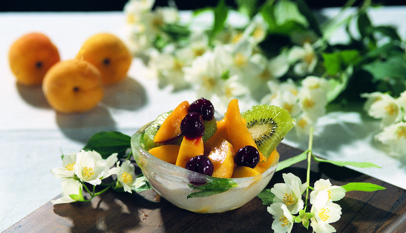 Buz çanağını oluşturmak için, orta boy plastik bir kasenin yarısına kadar su doldurun. İçine 1-2 adet nane yaprağı yerleştirin. Üzerine, içi yarısına kadar su dolu daha küçük bir plastik kase yerleştirin. Bu şekilde buzlukta dondurun. Sonrasında buz çanağını bıçak yardımıyla buz çıkarır gibi çıkarın. Oluşan boşluğun içine doğranmış meyveleri koyup servis yapın.AŞÇININ NOTUNane yapraklarının yerine dilerseniz çiçek veya ince doıranmış meyve çeşitleri de koyabilirsiniz.