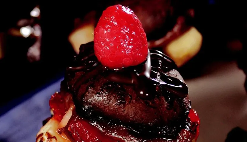 Bir tencereye yarıya kadar su doldurun ve kaynamaya başlayınca ocaktan alıp içine cam bir kap yerleştirin. Bu kabın içine yumurtaları ve şekeri koyup mikserle 5 dakika çırpın. Kabı sudan çıkartıp içine un, kakao, toz badem ve rendelenmiş portakal kabuğunu ilave ederek çırpmaya devam edin. Bir fırın tepsine yağlı kağıt serin ve hazırladığınız karışımdan ikişer çorba kaşığı alıp parçalar halinde tepsiye dökün. Önceden ısıtılmış 180 derece fırında 13 dakika pişirin. Kreması için, krem şanti, kakao ve soğuk sütü karıştırın. Mikserin önce yavaş sonra hızlı devri ile koyulaşana kadar çırpın ve bir krema sıkacağına doldurun. Tüm meyveleri küçük doğrayıp, karıştırın. Çikolatayı benmari usulü eritip, kurabiyelerin düz yüzeylerine sürün. Hazırladığınız kremadan kurabiyelerin yarısının üzerine sıkın. Kremanın üzerine de bir çorba kaşığı meyveli malzemeden döküp üstüne tekrar bir kurabiye kapatın. Üzerini çilek ya da frambuazla süsleyin.