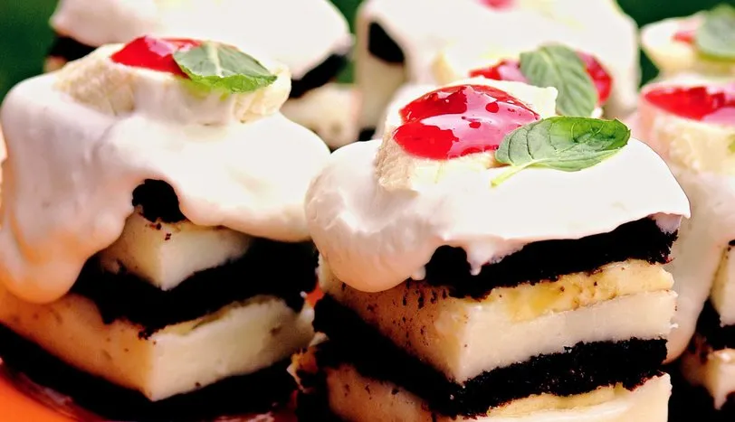 Hamur için yumurta ve toz şekeri bir kaba alıp koyulaşana kadar çırpın. Kakaolu toz pudingleri ekleyip biraz daha çırpın. 25x35 cm'lik 3 adet kalıbın dibini yağlı kağıtla kaplayın. Hamuru kalıplara paylaştırın. Önceden ısıtılmış 200 derece fırında 10 dakika pişirin. Soğuması için kenara alın. Diğer tarafta krema için yarım litre sütü toz şekerle kaynatın. Vanilyalı toz pudingleri 8 çorba kaşığı sütle karıştırın. Pudingli karışımı yavaş yavaş karıştırarak süte ekleyin. Koyulaşana kadar karıştırın. Tencereyi ocaktan alıp karıştırarak soğutun. İçine rom ve margarin ekleyin. Hamurların üzerine krema sürüp, dilimlenmiş muzları yerleştirin. Bu hamurları üst üste koyun. Çırpılmış krema döküp kare dilimleyin. Çilek reçeli ve nane yaprağı ile süsleyerek servis yapın.