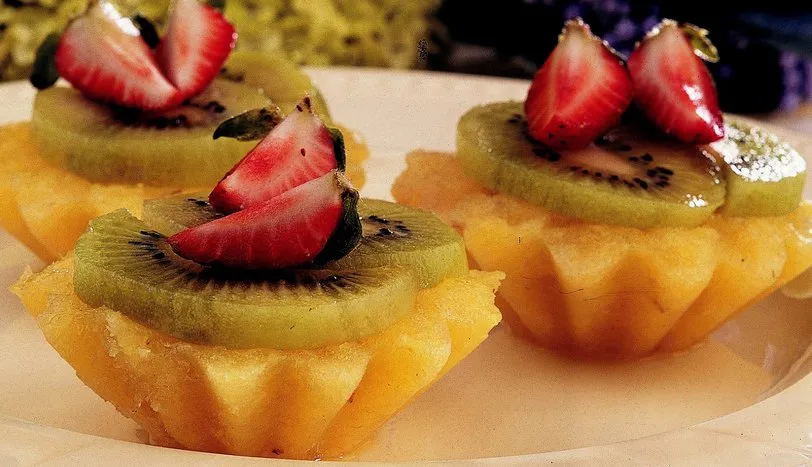 Ananasın kabuğunu soyup robotta püre haline getirin. Pürenin içine pudraşekeri ekleyip karıştırın. Karışımı tartölet kalıplarına pay edin. Buzluğa atıp dondurun. Kalıpları 3-4 saat sonra buzluktan çıkartın. İnce uçlu bir bıçağın ucuyla kalıplarından çıkarıp servis tabağına alın. Kivilerin kabuğunu soyup halka şeklinde doğrayın. Tartöletlerin üzerini kivi ve çilekle süsleyip servis yapın.