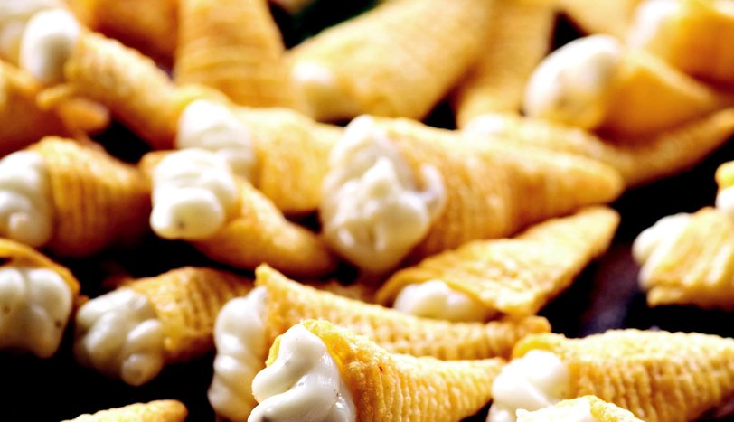 İç harcı için labne peynirini derin bir kaba alın. Dolmalık fıstığı havanda dövün ve sarmısakla birlikte peyniriniçine katın. Zeytinyağı ve tuz ilave edip, tüm malzemeyi karıştırın. Sıkma torbasına doldurun ve cipslerin içine bu karışımı doldurup, servis yapın.