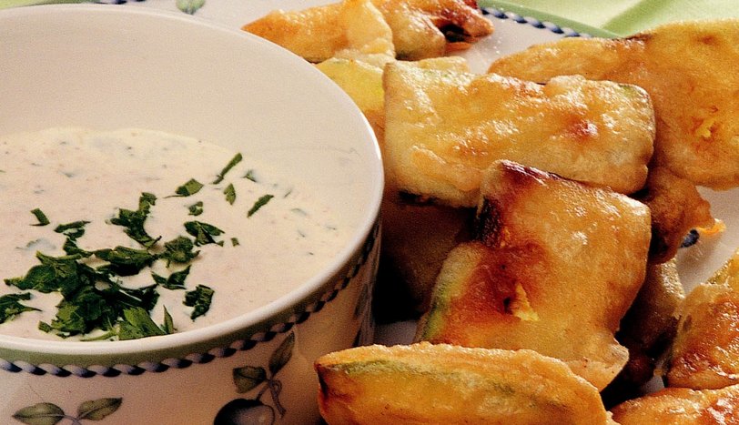 Kabakları temizleyip ortadan ikiye kesin. İnce ince dilimleyin. Un, su ve tuzu karıştırarak boza kıvamına getirin. Kabak dilimlerini bu karışıma bulayıp kızgın yağda kızartın. Sos için sarmısak, ceviz ve ince kıyılmış maydanozu blenderden geçirin.