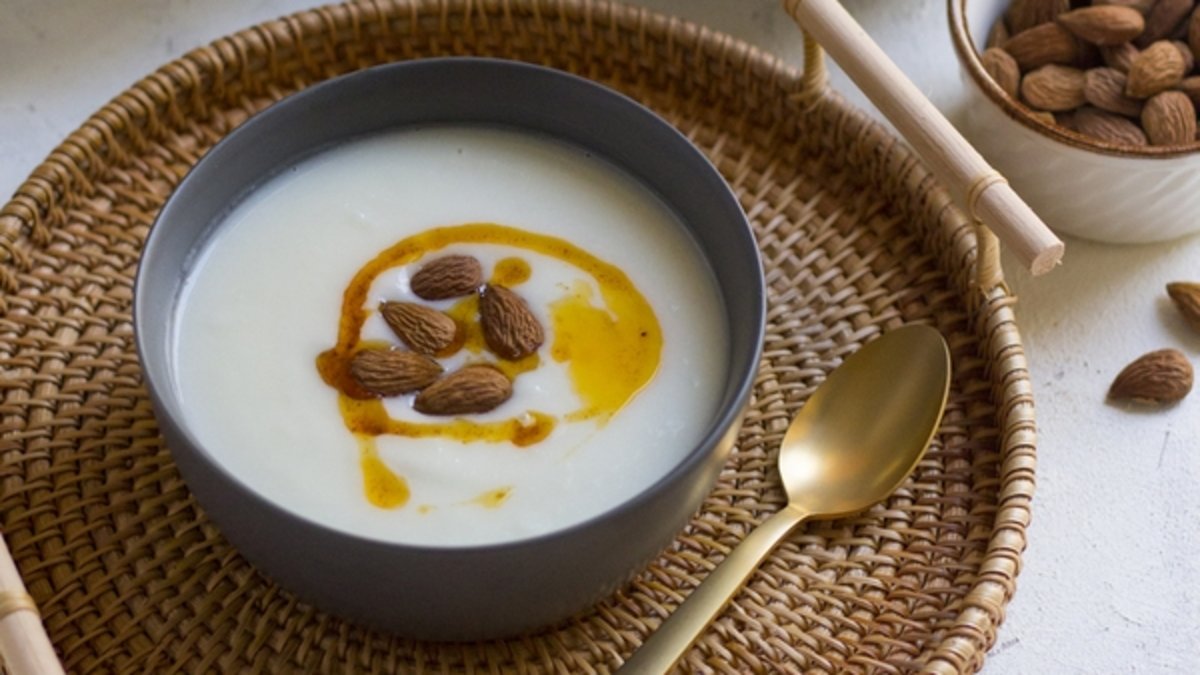 Tuz ve karabiberini ayarlayıp karıştırın. Blenderde çekip kaselere pay edin. Üzeri için zeytinyağını bir sos tavasına alın. Toz kırmızıbiberi ekleyip biraz ısıtın. Çorbanın üzerine gezdirip bademle süsleyin ve servis yapın.