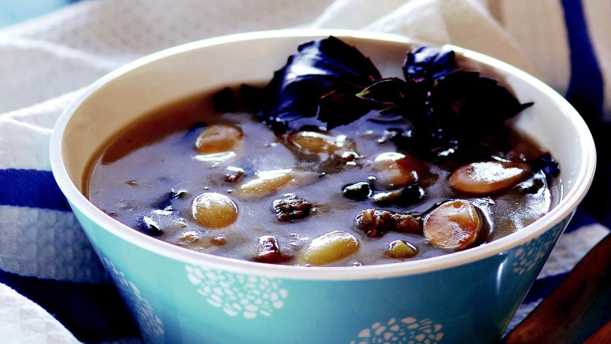 Et suyu ve suyu ilave edin. Kaynamaya başlayınca kıyma, patlıcan, tuz, karabiber ve kimyon ekleyin. 10 dakika sonra bademleri ilave edin. Bir taşım daha kaynatıp ocaktan alın. Kıyılmış reyhan ilave edip servis yapın.