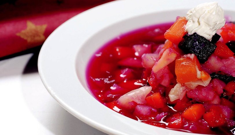 Domates püresi, salça ve tuzu katarak kısık ateşte yaklaşık 45 dakika pişirin. Pişmesine yakın lahana, pancar, kvas ve et suyunu ilave ettikten sonra ocaktan alın. Servis tabağına alarak üzerine sıkma torbası ile smetana sıkarak servis yapın.