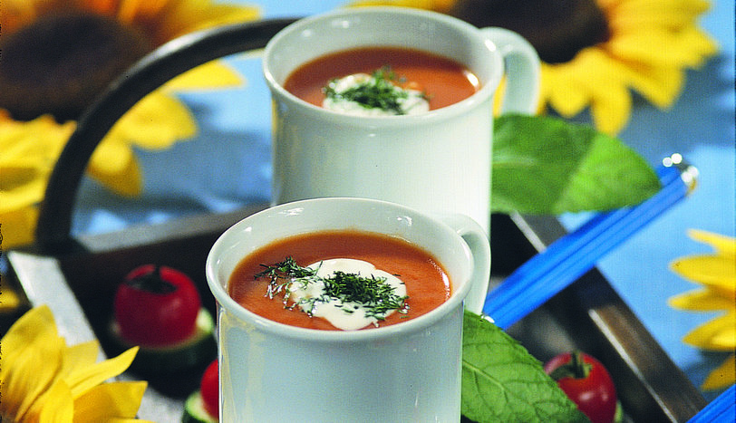 Tencereye salçayı, tereyağını ve unu koyup, 3 dakika kavurun. Unun rengi değişince üzerine süt ve suyu ilave edip, çırpma teli ile çırparak 6 dakika kaynatın. Ardından ince kıyılmış fesleğen ve tuzu katıp 1 dakika daha kaynatıp tencereyi ocaktan alın. Çorbayı servis tabaklarına aktarıp üzerlerine çiğ krema ilave ederek servis yapın.
