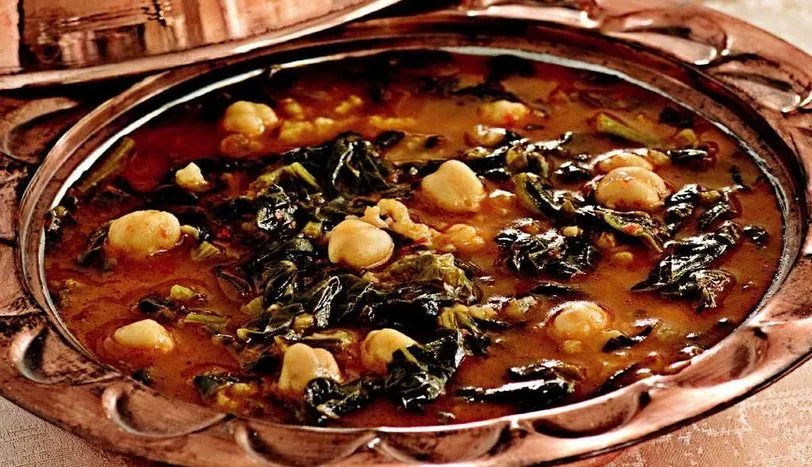 Ispanağı yıkayıp, süzülmeye bırakın. İyice süzüldükten sonra iri parçalar halinde doğrayın. Yemeklik doğranmış soğan ve salçayı sıvı yağda kavurun. Ispanak, tuz ve pul biber ilave edin. Nohut ve birkaç kez yıkadığınız pirinç ile suyu ekleyin. Tane sumağı ılık suyun içinde 15 dakika bekletin ve süzün. Süzdüğünüz suyu üzerine katın ve kısık ateşte pirinç ile ıspanak yumuşayana kadar pişmeye bırakın.