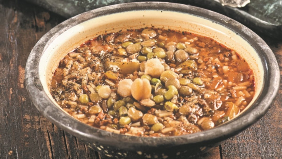 Kaynadıktan 5 dakika sonra kesme makarnayı ve bakliyatları katıp, kısık ateşte 15-20 dakika pişirin. Karabiber ve naneyi ekleyip, karıştırdıktan sonra 5 dakika dinlendirip, sıcak servis yapın.