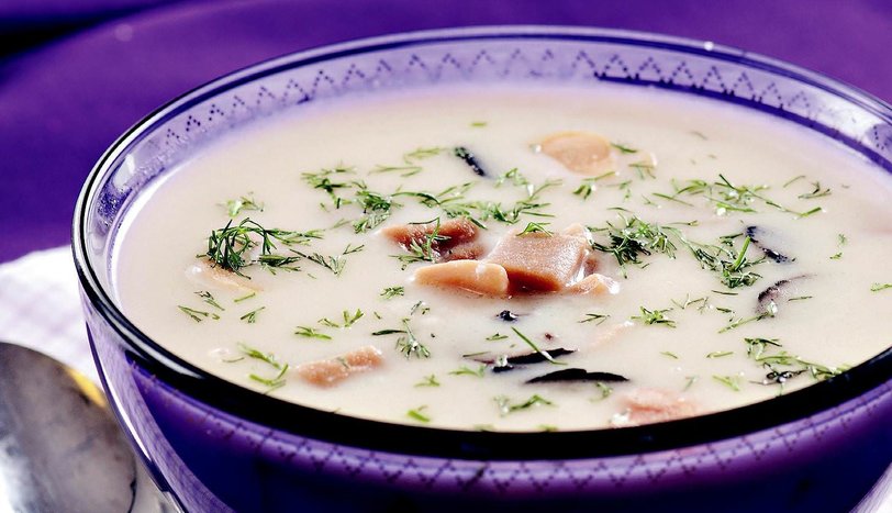 Çorba için, bir tencereye aldığınız un ve tereyağını rengi dönene kadar kavurun. Üzerine soğuk et suyu ve sütü ilave ederken, bir yandan da karıştırın. Koyu bir kıvam alana kadar karıştırmaya devam edin. İçine krema katın ve kaynamaya bırakın. Kaynadıktan sonra kısık ateşte 10 dakika pişirin ve tuzunu ayarlayın.