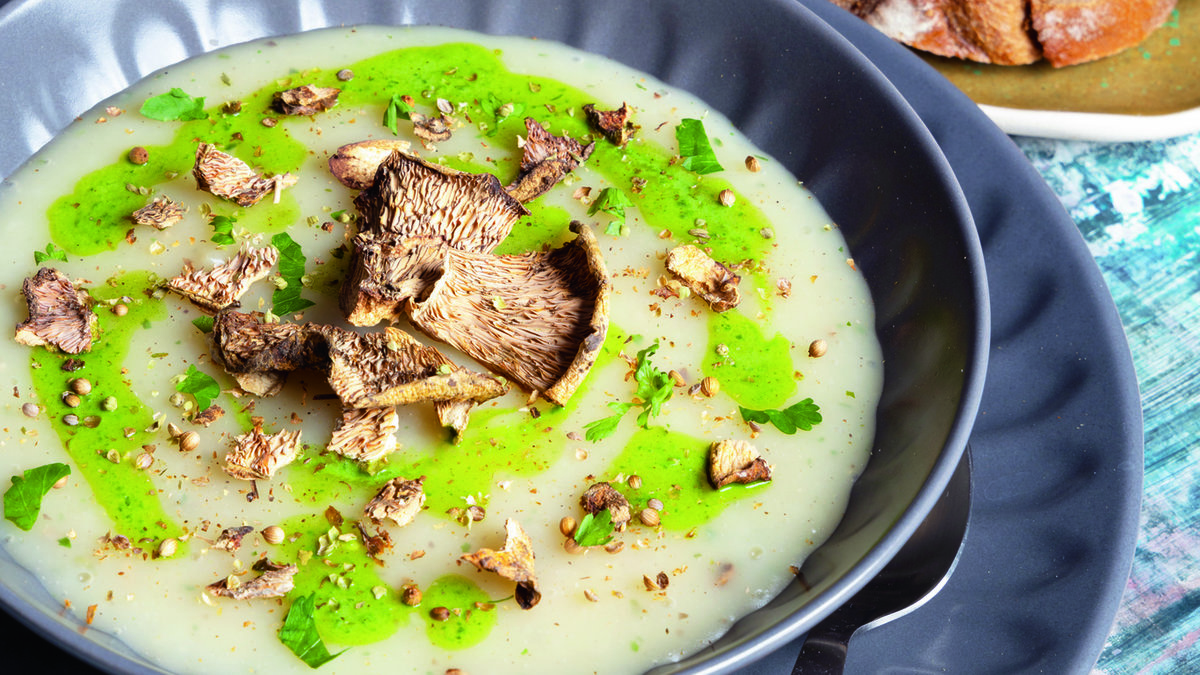 Çorbayı servis tabaklarına alıp üzerine yeşil yağ gezdirin. Kenara ayırdığınız Kanlıca mantarlarından yerleştirin. Maydanoz ve kişniş tohumu serpip servis yapın.