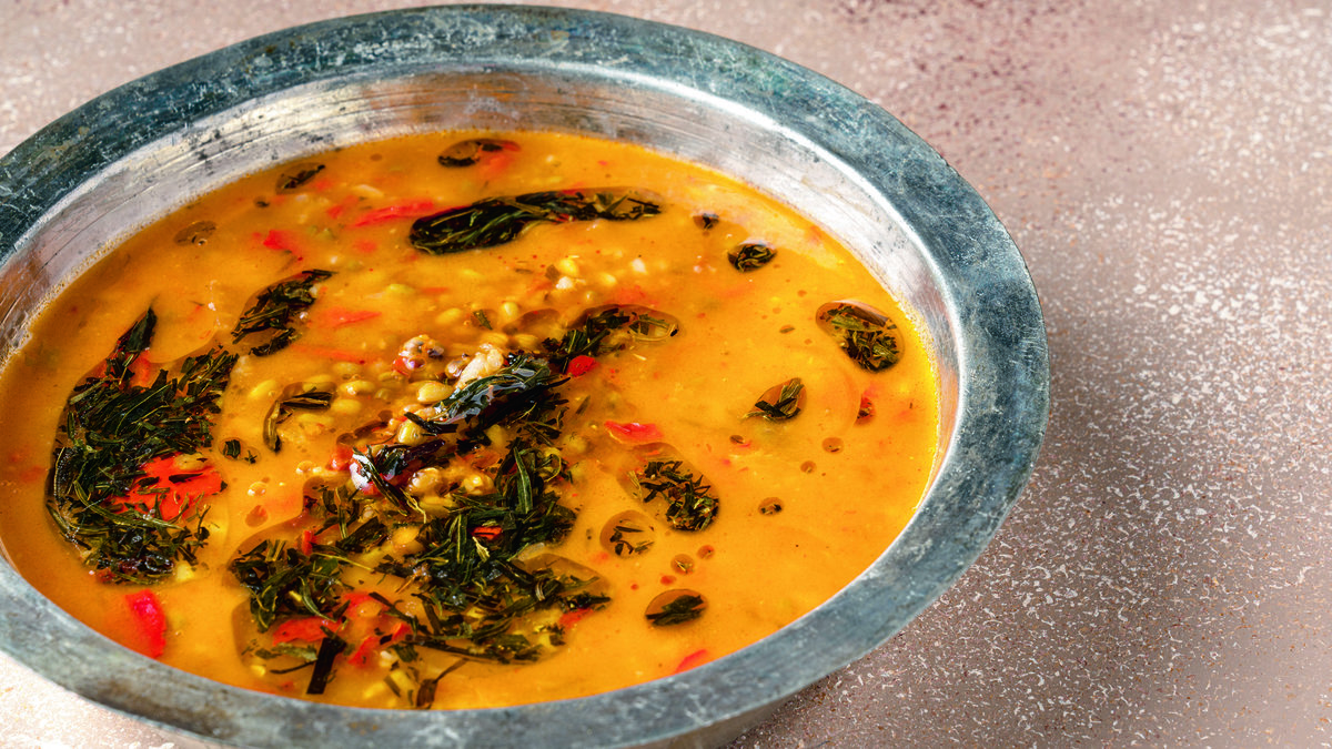 Üzeri için yağı bir tavada ısıtın. Yağın harı geçince kuru tarhun ve pul biber ekleyin. Kaselere bölünen çorbanın üzerine baharatlı yağı gezdirin. En son karabiber serpip servis yapın.