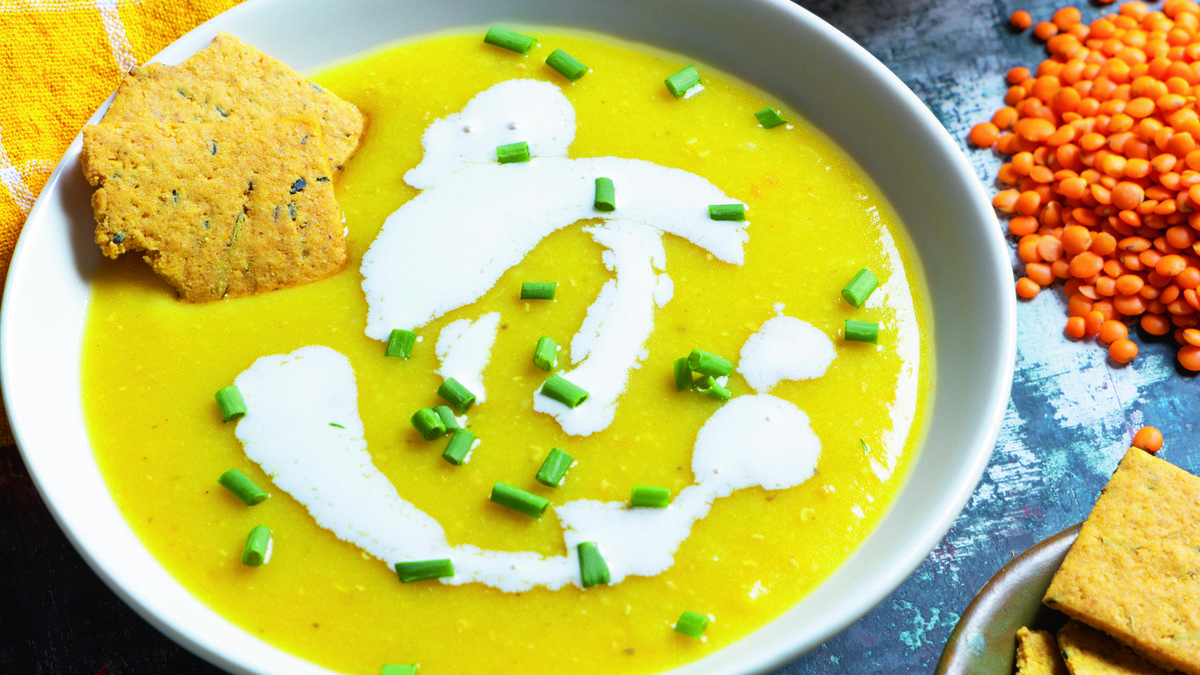 Mercimeği yıkayıp suyunu süzün ve tencereye alın. Üzerine kabukları temizlenmiş soğan, patates, bal kabağı, havuç ve sarımsağı ekleyin. Tuz ve zerdeçal ilave edip, malzemenin üzerini beş parmak geçecek kadar tavuk suyu ekleyin. Mercimek yumuşayana dek, orta ısıda haşlayın. Ocaktan alıp tereyağını katıp blender'den geçirin.