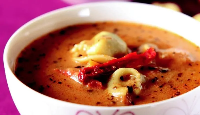 Kırmızı biber ve domatesleri fırında közleyip kabuklarını soyun. Daha sonra kırmızı biberi jülyen, domatesi küp doğrayın. Sıvı yağı bir tencereye alıp rendelenmiş havuç, kereviz, kabak, patates, soğan ve kırmızı biberi ekleyip sote edin. Salçayı ilave edip, 1-2 defa çevirdikten sonra domatesi katın. Çırpma teli ile tüm malzemeyi çırpın ve ocağın altını kapatın. Diğer taraftan sos için tereyağını kızdırıp, unu pembeleşene kadar kavurun. Sütü azar azar ilave edip, koyu bir kıvam elde edene kadar karıştırarak pişirin. Bu sosu sebzelerin üzerine boşaltın. Tencereyi tekrar ocağa oturtun ve tüm malzeme özleşene kadar çırpma teli ile çırpın. Koyu bir kıvama gelene kadar su ilave edin ve kaynamaya bırakın. Dibine yapışmaması için tahta bir kaşıkla sürekli karıştırarak kaynatın. Daha sonra içine sıcak suda 15 dakika bekletip, jülyen doğradığınız kurutulmuş domatesi, renkli makarnayı ilave edin ve 5 dakika kısık ateşte pişirin. Kekik, zerdeçal, tuz ve karabiber ekledikten sonra çorbayı ocaktan alın. Servis yapmadan önce haşlanmış tortellini ilave edin ve sıcak olarak servis yapın.
