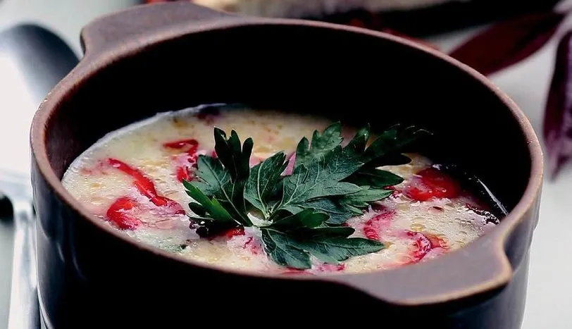 Pırasaların koyu yeşil yapraklarını ayıklayın. Tereyağını derin ve yayvan bir tencerede eritin. İnce kıydığınız pırasa ve soğanı ilave edin. Hafif ateşte ara sıra karıştırarak 10 dakika soteleyin. Patatesi incecik kıyarak, et suyu ve su ile beraber ocaktaki tencereye ekleyin. Tencerenin ağzını kapatmadan kaynamaya bırakın. Kaynamaya başladığında tencerenin ağzını kapatın. 30 dakika pişirin. Ocağın altını kapatarak ılınmaya bırakın. Ilındığında süzgeçten geçirip soğutun. Krema, kırmızı soğan ve rendelenmiş muskatı karıştırıp çorbaya ilave edin. Tuz ve karabiberini ayarlayın. Soğutulmuş kaselere alarak servis yapın.