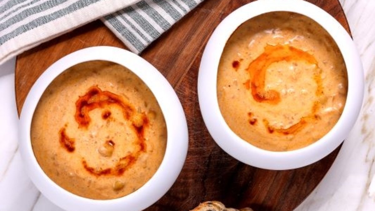 Blender set yardımıyla pürüzsüz bir kıvam elde edene kadar çırpın. Kalan malzemeyi katıp karıştırın ve 5 dakika pişirin.