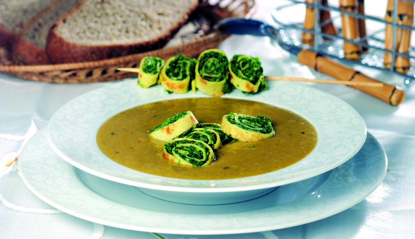 Fasulyeleri incecik doğrayıp, bol suda haşlayın. Suyunu süzdükten sonra, üzerine soğuk su ekleyip 15 dakika bekletin (rengini koruması için). Fasulyeleri sudan alıp, 4 su bardağı sıcak suda 15 dakika pişirin. Un ve yoğurdu birlikte çırpın. Süzgeçten geçirip fasulyeye ekleyin. Domatesin kabuklarını soyup doğrayın. Soğanı doğrayıp, sıvı yağda kavurun ve üzerine domatesleri ilave edin. 10 dakika birlikte pişirip fasulyeye karıştırın. Et suyu tabletini çorbaya katıp bir taşım kaynatın ve ocaktan alın. Krepleri hazırlamak için; süt, su, un ve tuzu bir kasede iyice çırpın. Hazırladığınız karışımı üçe bölün. Orta boy bir tavayı tereyağı ile yağlayıp, krep hamuru karışımını tavaya dökün. Arkalı önlü pişirin. Maydanoz ve sarımsağı incecik kıyın. Zeytinyağında 1-2 dakika kavurup, kreplerin üzerine paylaştırın. Krepleri rulo haline getirip dilimleyin ve çorbayı bu dilimlerle süsleyerek servis yapın.