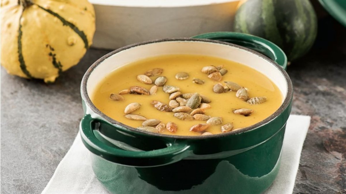 Ocaktan aldıktan sonra el blenderi yardımıyla püre haline getirin. Kabak çekirdeklerini önceden ısıtılmış 150 derece fırında 15 dakika kavurun. Çorbayı kaselere aldıktan sonra üzerini kabak çekirdeği ile süsleyip servis yapın.AŞÇININ NOTUÇorba ve dip sosların yanına çok yakışan baharatlı lavaşı yemek öncesi atıştırmalık olarak da ikram edebilirsiniz. Yukarıda verdiğimiz ölçüden 2 fırın tepsisi baharatlı lavaş hazırlayabilirsiniz. Lavaş ince bir yapıya sahip olduğundan fırınlarken kısa sürede yanabilir, o nedenle pembeleşince hemen fırından almaya özen gösterin.