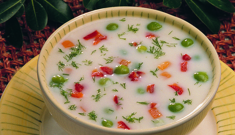 Ön hazırlık olarak biber, havuç ve bezelyeleri aynı tencerede haşlayalım. Biber ve havucu tavla zarı iriliğinde doğrayalım. 1 Bir kapta yumurta sarısını, unu ve sütü çırpma teli ile karıştırıp, pürüzsüz bir kıvam almasını sağlayalım. Tencereye sıvıyağı alalım. Küp doğranmış soğanı ekleyip, pembeleştirelim. Unu ekleyip, hafifçe sararana dek kavuralım. Et suyunu ekleyip, kaynatalım. Hazırladığımız sütlü yumurtalı terbiyeyi azar azar ve karıştırarak ekleyelim. 2 Haşlanmış havucu ve bezelyeleri, biberleri, küçük doğranmış salamları, tuzu ve karabiberi ekleyip, sürekli karıştırarak üzeri göz göz olana dek pişirelim. Çorbayı ateşten alıp, kıyılmış dereotu ve karabiber serperek, servis yapalım.
