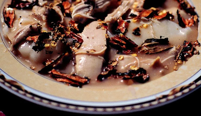 Unu bir tavada sararana dek kavurun. Soğutup, üzerine suyu ilave edin ve karıştırarak kaynatın. Koyulaşınca bir tepsiye iki parmak kalındığında dökün ve ılıtın. Ayrı bir yerde tavuk budunu veya göğsünü bir tencerede 7 su bardağı su ile pişirin. Pişmeye yakın tuzunu ayarlayın. Pişen tavukları tencereden alıp, etini ince ince didikleyin. Kalan suyunu süzgeçten geçirerek, bir başka tencereye aktarın. Tencereyi ocağa alıp, kaynamaya bırakın. Bir kaseye 3 çorba kaşığı unu alın ve sulandırın. Kaynayan tavuk suyuna yavaş yavaş sulandırılmış unu akıtın. Koyulaşana dek karıştırın. Karabiber ve tuzunu ekleyin. Çorbanın inmesine yakın koruk ekşisini, parçalanmış tavuk etlerini ilave edip, bir taşım kaynatıp tencereyi ocaktan alın. Bir tavada zeytinyağını kızdırın. Salçayı ekleyip, 2-3 dakika kavurun. Kuru kırmızı biberi közleyip, elle parçalayın. Bir servis tabağına, daha önce tepsiye yaydığınız hamurdan kaşıkla parçalar alın. Üzerine sıcak çorbadan dökün. Üzerine kavrulmuş salçayı gezdirin. En son olarak közlenip, parçalanmış kırmızı biberden ekleyip, sıcak olarak servis yapın.