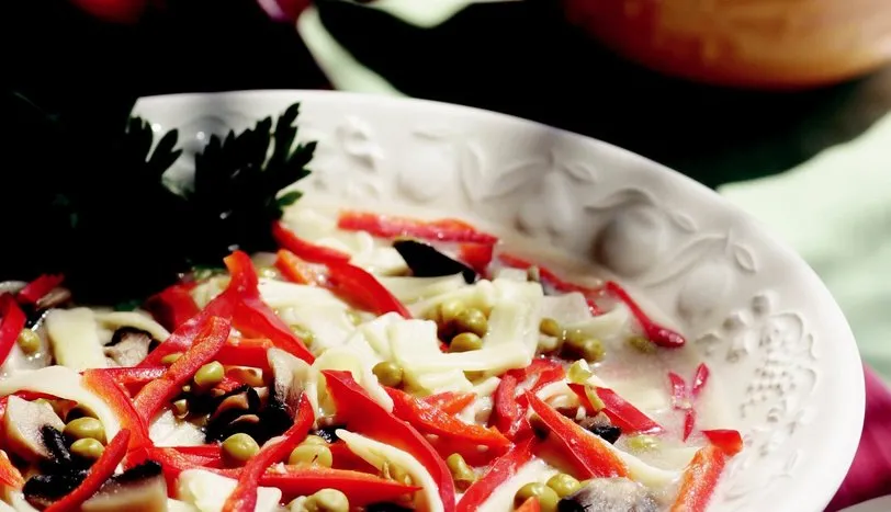 Erişteleri tuz eklenmiş bol suda haşlayıp süzün. Diğer taraftan mantarları doğrayıp 4 su bardağı suda haşlayın. Üzerine bezelyeleri, ince kıyılmış taze soğanı ve jülyen doğranmış kırmızı biberleri ilave edin. Sebzeler yumuşadığı zaman, haşladığınız erişteleri, 1 çorba kaşığı tahin, karabiber, tuz ve 2 çorba kaşığı soya sosunu ekleyin. 2-3 dakika pişirip ocaktan alın. Üzerine rendelenmiş kaşar peyniri serpip servis yapın.AŞÇININ NOTUÇorbaya tuz eklerken soya sosunun da tuzlu olduğunu dikkate almanızı tavsiye ederiz.