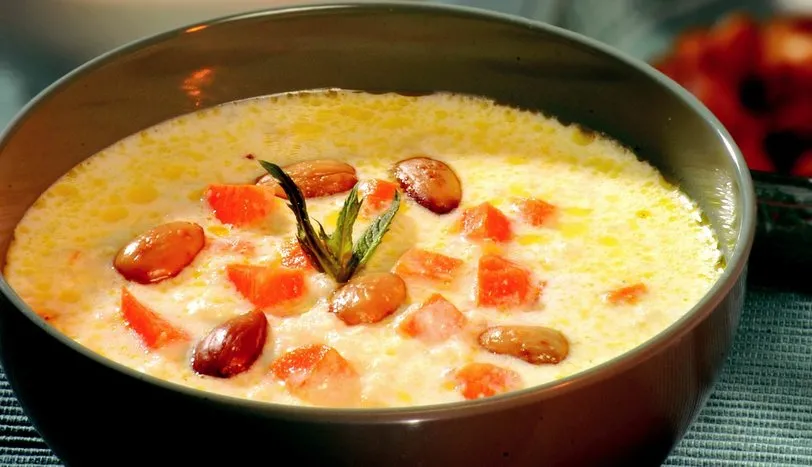 Tereyağını eritip, küp doğranmış havucu hafifçe oteleyin. Bir tencereye süt, su ve havucu ekleyip, pişmeye bırakın. Kaynayınca pirinci ekleyin. Tuz ve karabiberi ilave edin. Pirinç yumuşayınca ocaktan alın. Bademleri sıcak suda 4-5 dakika kaynatıp kabuklarını soyun. Daha sonra yapışmaz yüzeyli bir tavaya alıp, kavurun. Çorbanın üzerine serpiştirip, servis yapın.